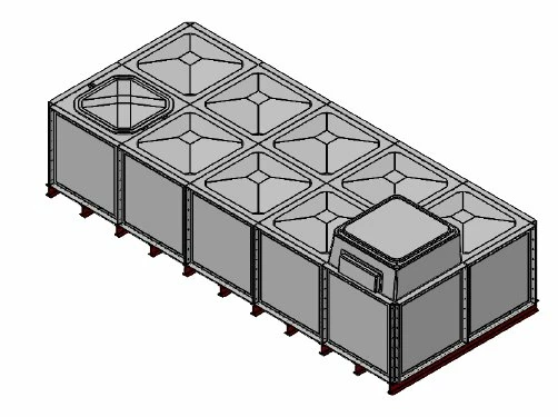 10000 Litre GRP Sectional Water Tank, a sectional tank with an internally flanged base and externally flanged sides. Modular construction utilising bolt together panels suitable for on-site assembly.