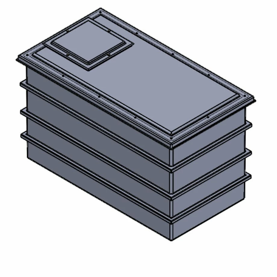 All internal surfaces, including the lid, have an Isophthalic white gel coat layer which provides a clinical smooth surface which will not support the growth of microbiological organisms. This gel coat layer is reinforced by the main GRP laminate, which provides the main structure of the tank body. The materials used are of the highest quality and applied with exacting production standards to assist in prevention of osmotic blistering. Further reinforcement is provided by square section steel tubing with fully welded corner joints. Steel reinforcement ensures that the softening and general deterioration encountered with timber supports is avoided, thus providing full structural reinforcement for the life of the tank. After the CFC free PU foam insulation and the steel reinforcement are fitted, the GRP outer skin is then applied. This ensures that both insulation and reinforcement are fully encapsulated and protected from external conditions.