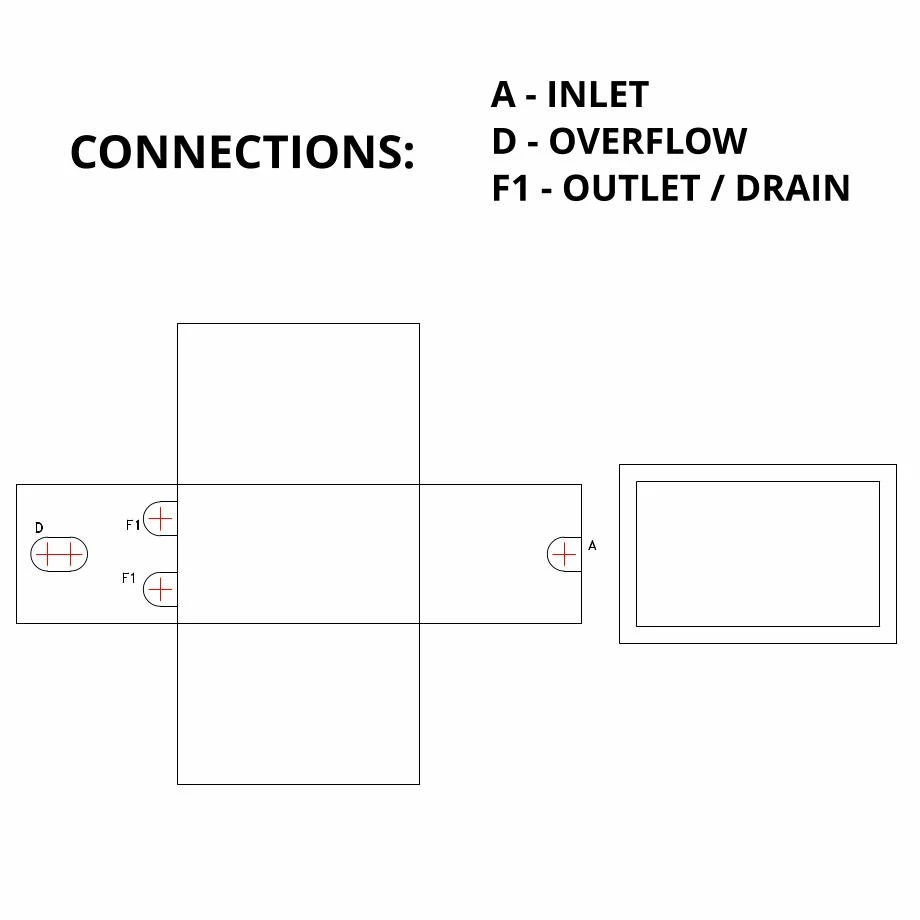 The tank is supplied with 2 low level connection pads, on the opposite end to the inlet.