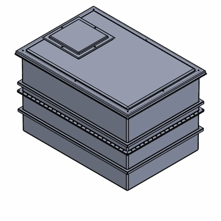 All internal surfaces, including the lid, have an Isophthalic white gel coat layer which provides a clinical smooth surface which will not support the growth of microbiological organisms. This gel coat layer is reinforced by the main GRP laminate, which provides the main structure of the tank body. The materials used are of the highest quality and applied with exacting production standards to assist in prevention of osmotic blistering. Further reinforcement is provided by square section steel tubing with fully welded corner joints. Steel reinforcement ensures that the softening and general deterioration encountered with timber supports is avoided, thus providing full structural reinforcement for the life of the tank. After the steel reinforcement is fitted, the GRP outer skin is then applied. This ensures that the reinforcement is fully encapsulated and protected from external conditions.