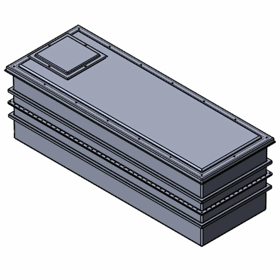 All internal surfaces, including the lid, have an Isophthalic white gel coat layer which provides a clinical smooth surface which will not support the growth of microbiological organisms. This gel coat layer is reinforced by the main GRP laminate, which provides the main structure of the tank body. The materials used are of the highest quality and applied with exacting production standards to assist in prevention of osmotic blistering. Further reinforcement is provided by square section steel tubing with fully welded corner joints. Steel reinforcement ensures that the softening and general deterioration encountered with timber supports is avoided, thus providing full structural reinforcement for the life of the tank.