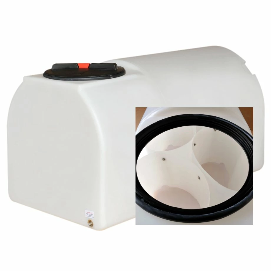 Our 900 litre Flat D-Shaped baffled water tank for the storage of potable water. This 900 Litre (238 gallon) D-Shaped flat baffled window cleaning / car valeting water storage tank is manufactured in natural translucent medium density polyethylene with a 1″ BSP outlet and large 16″ vented lid. Baffled water tanks are ideal for water transportation. The baffling is provided by the grooves / holes that go right through the tank – the ‘baffles’ stop the water sloshing from side to side. The Baffling reduces the movement of water in the tank during transport. Baffled water tanks are ideal for car valeters and car valeting. A high quality water storage tank for storing either potable or non potable water and a wide range of other liquids